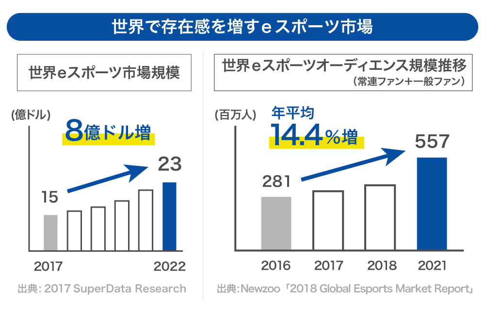è¿å¹Žãæ¥æ¡å€§ãèŠããeã¹ããŒãåžå Žãäžçã«ãããŠã¯2017幎ã«15åãã«ã ã£ãåžå ŽèŠæš¡ãã2023幎ã«ã¯23åãã«ã«ãªãããšãäºæž¬ãããŠããŸãããŸãããã¡ã³ã®è£Ÿéãæ¡å€§ããŠããã2016幎ã«2.8å人ã ã£ããªãŒãã£ãšã³ã¹æ°ã¯2021幎ã«ã¯5.6å人ã«ãŸã§æ¡å€§ããŠããŸãã