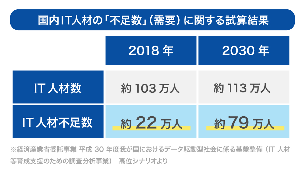 çŸåšãITããŒãºã®é«ãŸãããäžçäžã«ãããŠIT人æã®éèŠãé«ãŸã£ãŠããŸãããã®ãããªäžãåœå ã«ãããŠã¯äŸçµŠäžè¶³ãçºçããŠããã2030幎ã«ã¯çŽ79äžäººã®IT人æäžè¶³ãçãŸãããšè©Šç®ãããŠããŸãïŒ»çµæžç£æ¥çã®èª¿æ»(2018幎)ã