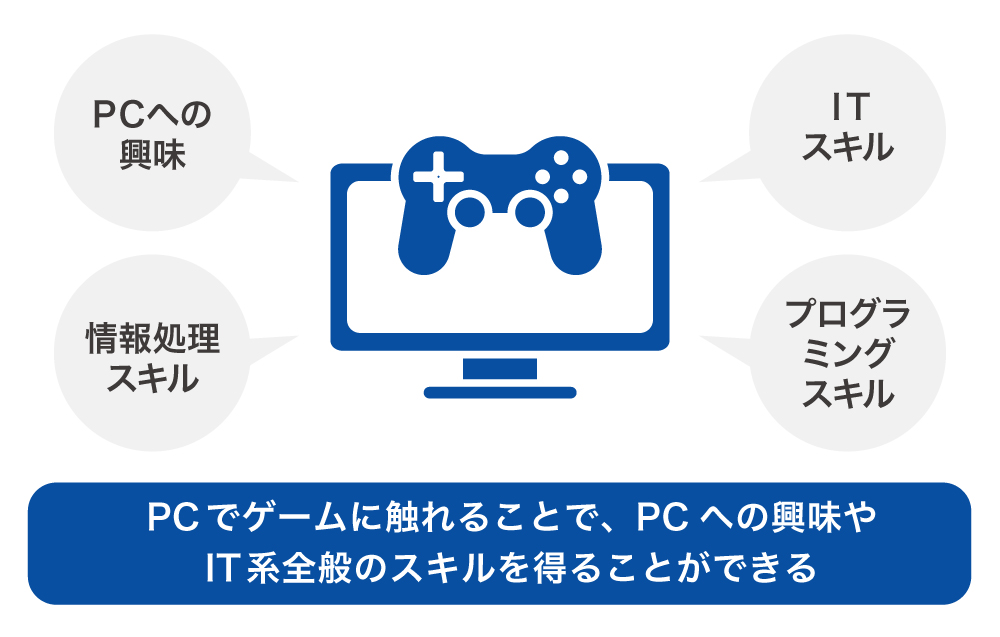 ã²ãŒã ãšãããšæ¥æ¬ã§ã¯äžè¬çã«ã¯å®¶åºçšã²ãŒã æ©åšãæãæµ®ãã¹ããããããŸããããæ¬§ç±³ã§ã¯eã¹ããŒãïŒPCã䜿çšããã²ãŒã ïŒãéããŠéå°å¹Žæããã²ãŒã ã«è§Šããããšã§æ§ã ãªç¥èãåŸãããšãã§ãããšèããããŠããŸããäŸãã°ãè¯ãã¹ããã¯ã®PCãéžãã ããã«ã¹ã¿ã PCã®äœæãããã«ã¯ãããã¯ãŒã¯ã¹ãã«ãåç»ç·šéã¹ãã«ãªã©ãITã¹ãã«ãå¹ åºã身ã«ã€ããããšãã§ããŸãã