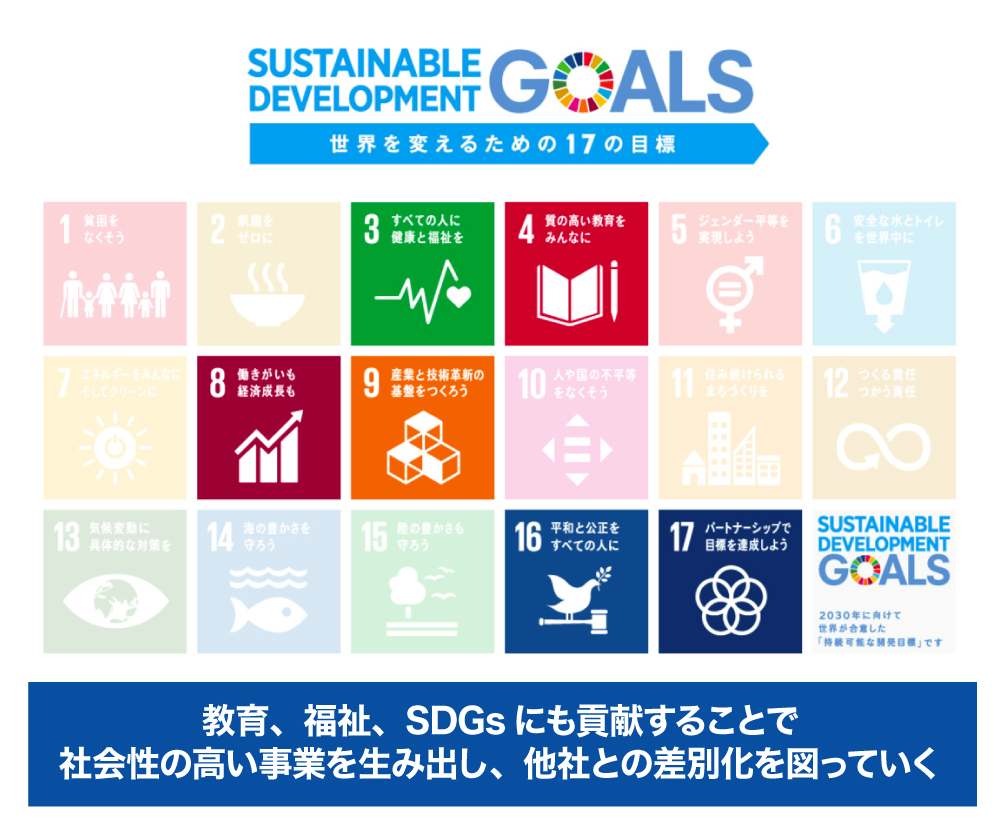ãŸãããã®æ§ãªäºæ¥ãåµåºããŠããããšã§æè²ãçŠç¥ãSDGsã«ãè²¢ç®ããããšã§ãç€ŸäŒæ§ã®é«ãããžãã¹ã«ããªã£ãŠããŸãã