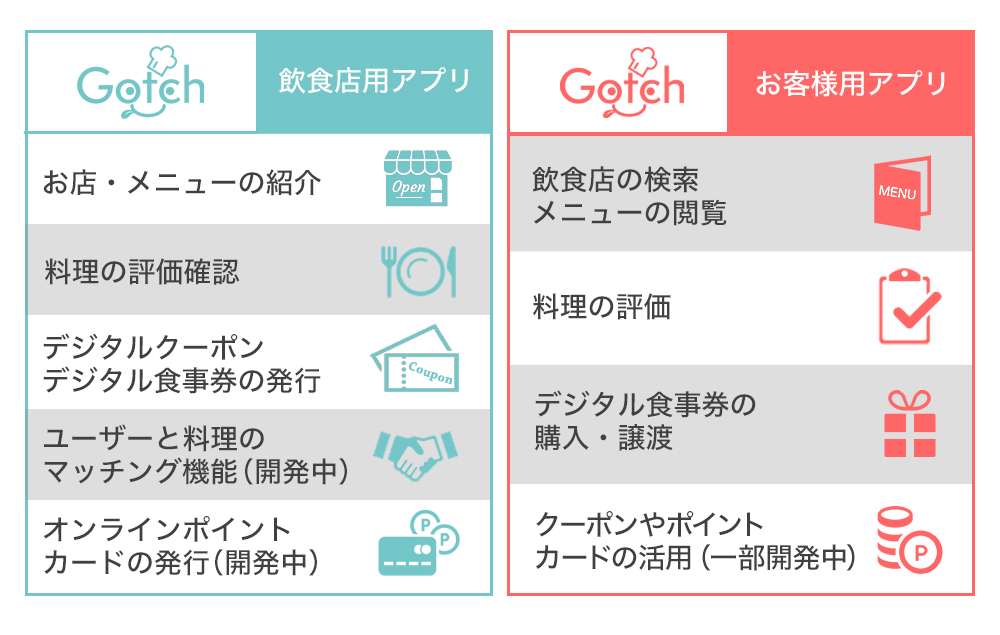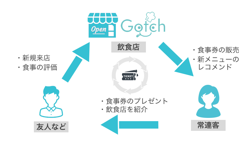 弊社は、新規顧客の獲得に苦しむ飲食店を少しでも救済すべく、スマホ上でデジタル食事券を発行し、友人にプレゼントできるサービスプラットフォーム「Gotch」を開発し、リピーターを介して新しいお客様を呼び込むサービスを提供致します。