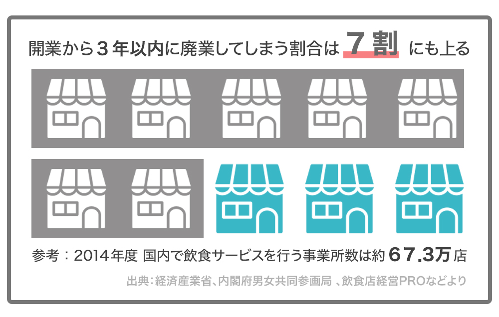 飲食店を新規開業後、1年以内に廃業する割合は約3割、3年目で廃業する割合は7割になるともいわれています(出典:飲食店経営PROなど)。
