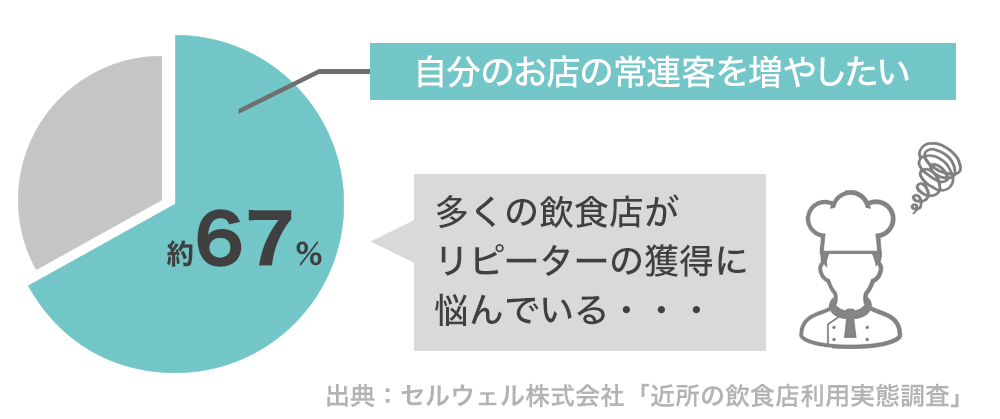 市場調査では、国内の飲食店の約67%の飲食店が“常連客を増やしたい”と切望しているという調査結果も出ています(調査会社 セルウェル発表)。