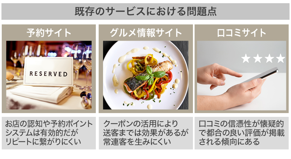 飲食店の予約アプリや、口コミアプリ、その他クーポンサイトなどは市場に多く投入されています。しかし、その多くはマス(大衆)をターゲットにした、お店自体を認知させるためのツールであり、常連客の獲得には繋がりにくいものが殆どです。