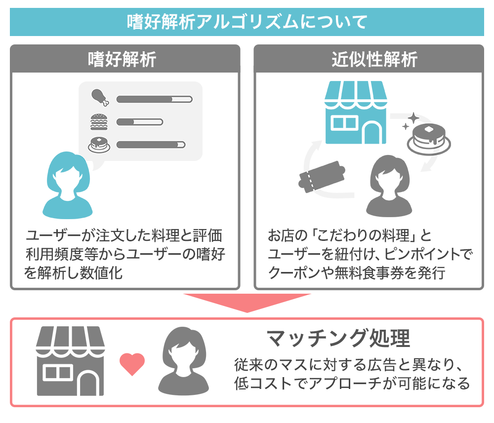 この機能では、アプリの利用頻度が増えることで、ユーザーの嗜好を解析し、そこで得た情報をもとに嗜好が類似する料理を自動的に紹介し、新しい店舗との出会いを創出します。