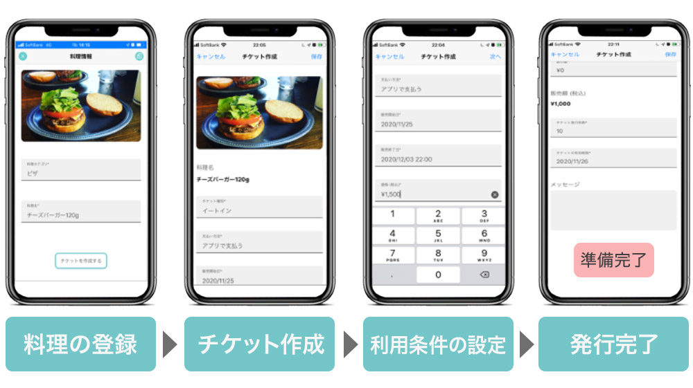 こだわりの料理やおすすめの逸品をデジタル食事券にして発行できるサービスを飲食店様向けに提供します。従来の業務アプリとは異なり、スマホファースト、簡単操作、3分で食事券を発行できます。ユーザーへは、料理軸で料理を探せる、購入した食事券をSNSで友人へプレゼントできる、そして見ていて楽しい、というこれまでにない食と出逢う体験を提供します。