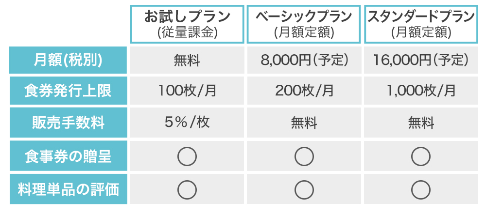 例えば、サービスを限定した無料プランから、食事券の発行枚数を最大1か月1,000枚まで発行できるプレミアムプランなどです。