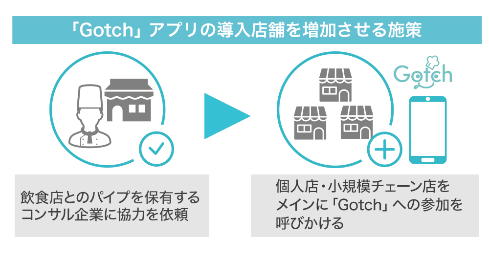 このように先ずは、都内を中心に個人店や小規模チェーンを展開している飲食店に向けて「Gotch」への加盟を呼びかけ、その飲食店の既存の顧客に向けて、デジタル食事券の発行を行い、消費者側のユーザー獲得を行っていきたいと考えています。