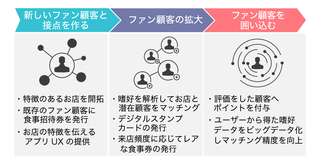 アプリ内に蓄積されたビッグデータを元にユーザーの嗜好を解析することでユーザーの好みを特定することが可能になります。このデータを使い、お店の料理を好きになってくれるユーザーを抽出し、ピンポイントでプロモーションやクーポンを発行することを可能にする計画です。