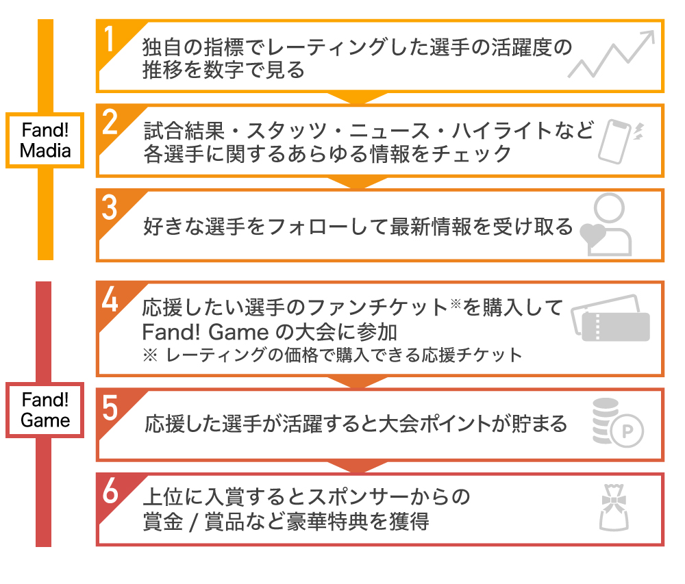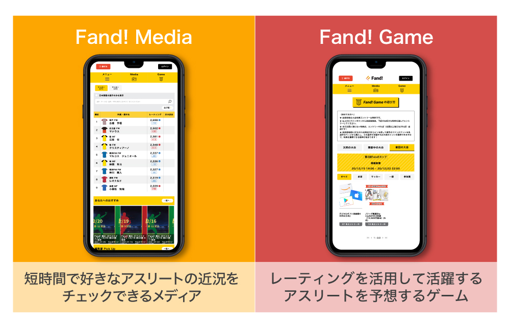 そこで、弊社が運営する「Fand!」は、試合を見る時間のないスポーツファンのために、短時間で好きなアスリートのレーティングやニュース/試合ハイライトをチェックできるメディア機能と、レーティングを活用し活躍するアスリートを予想するゲーム機能を開発し、試合のライブ中継とは異なる新たなスポーツの楽しみ方を創りました。