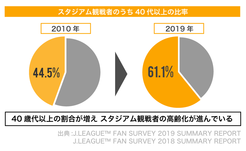 また、スタジアムに試合を観戦に行くファンの高齢化も顕著になってきています。Jリーグのスタジアム観戦者のデータを見ると、2010年は30代以下が過半数を占めていたのに対し、2019年は40代以上が約61%を占める状況になりました(出典:J.LEAGUE™ FAN SURVEY SUMMARY REPORT)。