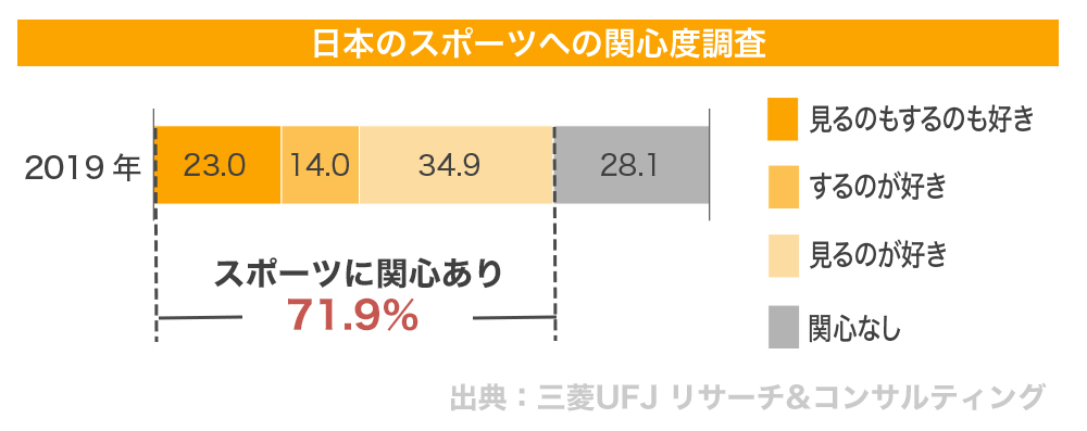 しかし一方で、スポーツを経験し、何かしらのスポーツに興味がある人は2019年度でも約72%と、高い割合となっています(出典:三菱UFJリサーチ&コンサルティング)。