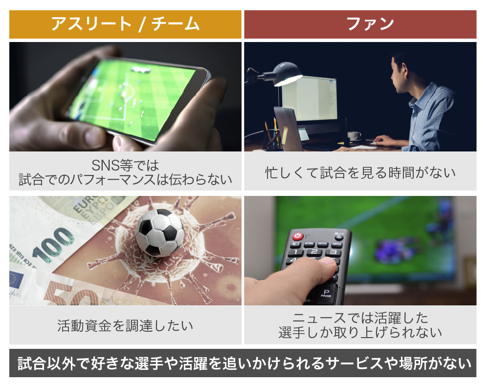現状を放置しておくと、スポーツ業界の衰退を招きかねません。それを防ぐためにも、現代のライフスタイルに合わせ、スポーツ観戦をせずともスポーツをエンタメとして楽しめる、かつ“個”にフォーカスしたサービスが必要だと考えました。