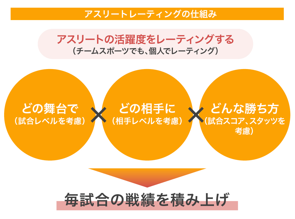 しかし、対象をアスリートにまで広げると、レーティングの変動が多様になることで情報量が増えゲーム性が高まり、ユーザー毎の楽しみ方ができます。