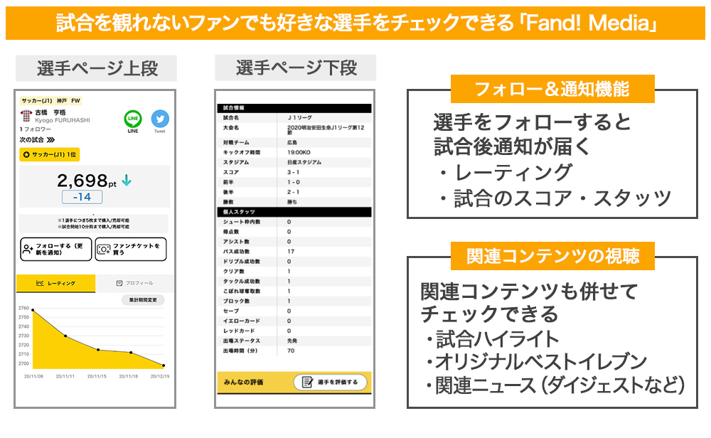 無料で利用できるメディアでは、試合ごとに変動するレーティングを試合のスタッツ(チームや個人のプレーの成績をまとめたもの)とともにチェックできたり、関連するニュースや試合のハイライトを視聴できます。またSNSのようにお気に入りのアスリートをフォローしておけば、レーティングに変動があった場合にお知らせが届き、試合での活躍を見逃すこともありません。短時間で好きな選手を追いかけることが可能です。