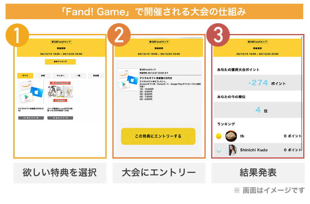 定期的に開催される「Fand! Game」の大会では、大会期間中にエントリーした人の中で上記の獲得ポイント数を争います。上位に入れば、スポンサーからの特典(賞金/賞品など)が獲得できます。