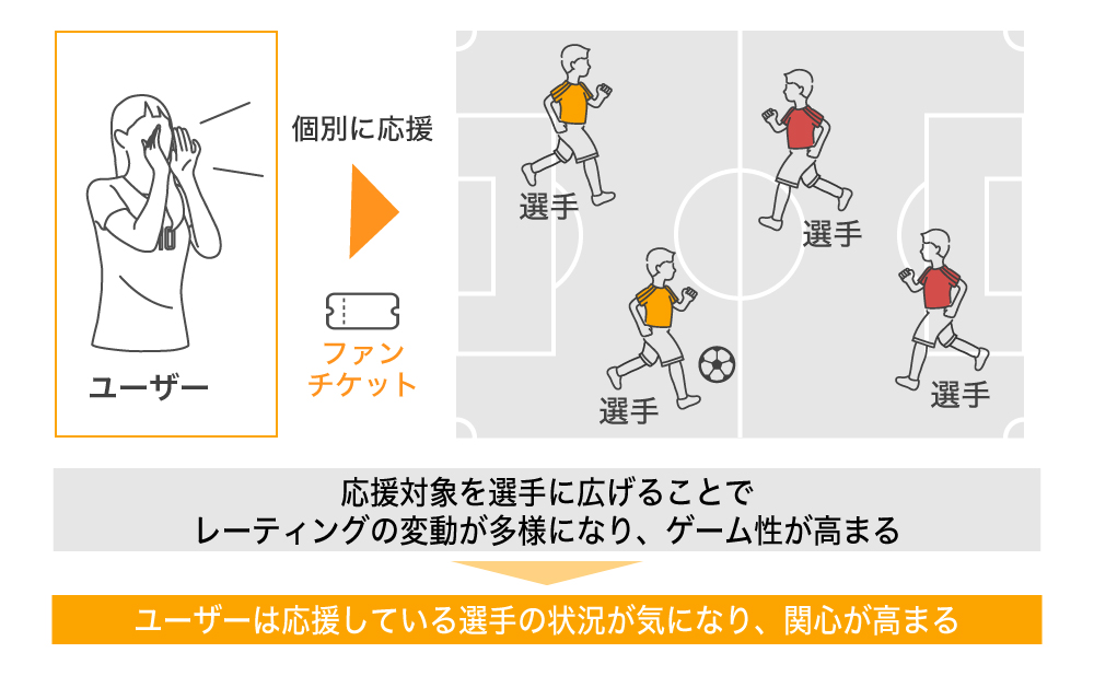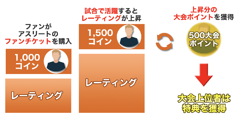 ユーザーは好きなタイミングでアスリートのファンチケット(レーティングの価格で購入できる応援チケット)を購入し、保有します。