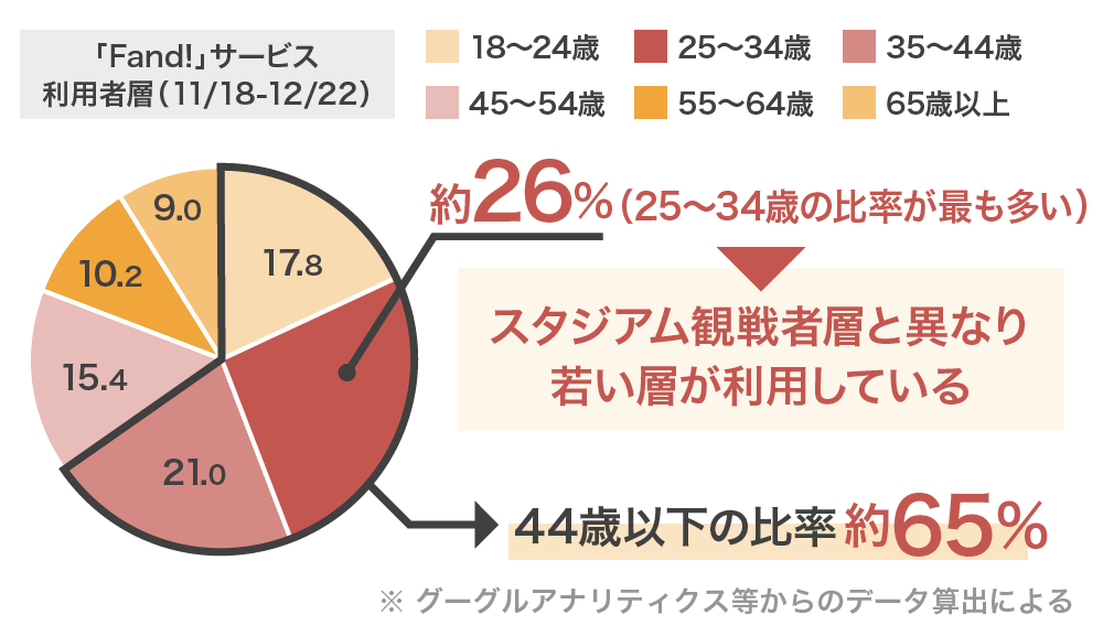 実際に、β版ローンチ後の11月〜12月に「Fand!」を利用したユーザーの属性を見てみると、25歳〜34歳が最も多く(26.3%)、44歳以下の占める割合が65.2%となっています。狙い通り若い世代を中心に利用される結果となりました。