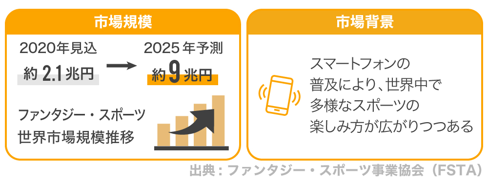「Fand! Game」に関して、一般にアスリート個人の活躍にフォーカスしたゲームはFantasy Sports(ファンタジー・スポーツ)と呼ばれ、海外ではスポーツベッティング(賭博)の一種として流行しています。世界では2020年に 約2.1兆円ともいわれる市場まで成長し(出典: ファンタジー・スポーツ事業協会)、スポーツビジネス市場を盛り上げる存在となっています。