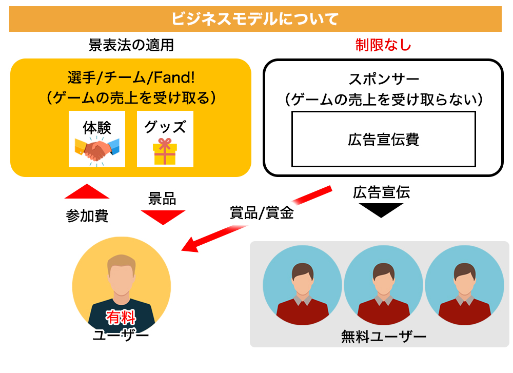 ユーザー間の賭博と「Fand!」とユーザー間の賭博、それぞれを回避する必要があります。前者は第三者であるスポンサーから賞金/賞品を提供してもらうスキームとし、負けたユーザーの課金したお金が勝ったユーザーに流れることのないように工夫しています(ユーザーから課金したお金はあくまでゲームの運営やサービス改善のため弊社が使用します)。