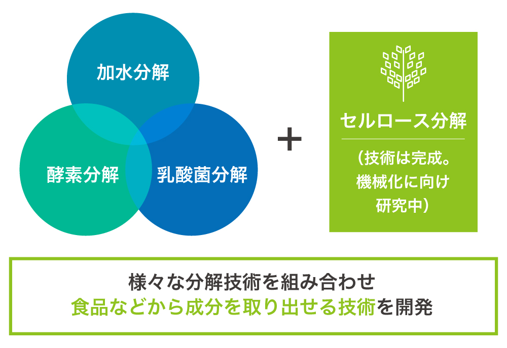 åŒç€Ÿã¯ãå æ°Žåè§£ããé µçŽ åè§£ããä¹³é žèåè§£ãã®3ã€ã®ã³ã¢æè¡ãçµã¿åãããããšã«ãããé£å廿£ç©ãåè§£ããç³ãã¿ã³ãã¯è³ªãããŸã¿æåãªã©ã®çްããæåã«åè§£ããŠãããŸãããããŠãåãåºããåæåãæŽ»çšããããšã§ãèª¿å³æã飿ããµããªã¡ã³ãçã®ã䟡å€ã®ãããã®ãã«åå©çšããããšãå¯èœã§ãã
