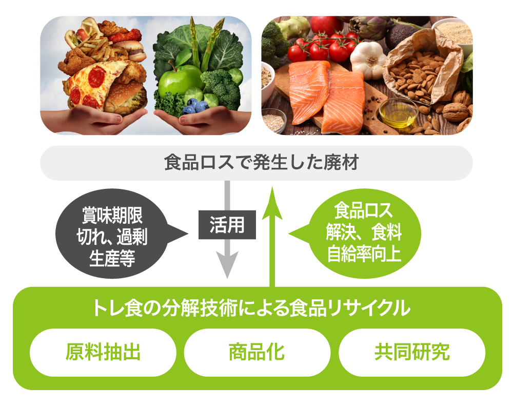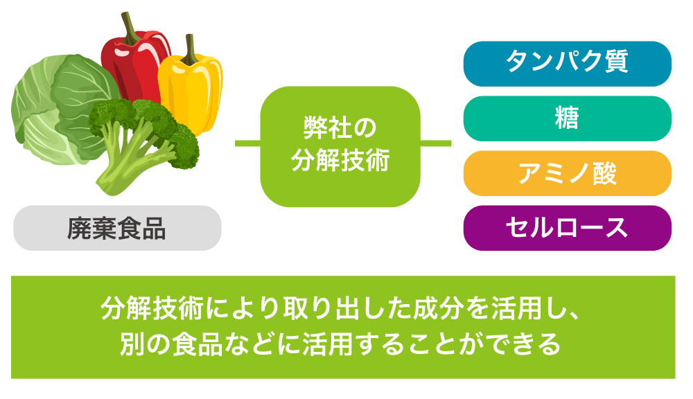 ãããã®æè¡ã掻çšãããšãé£å廿£ç©ãªã©ãç³ãã¿ã³ãã¯è³ªãããŸã¿æåãªã©ã«åè§£ããããšãã§ããåãåºããæåãå ã«å¥ã®é£åã«ãªãµã€ã¯ã«ã§ããŸãã