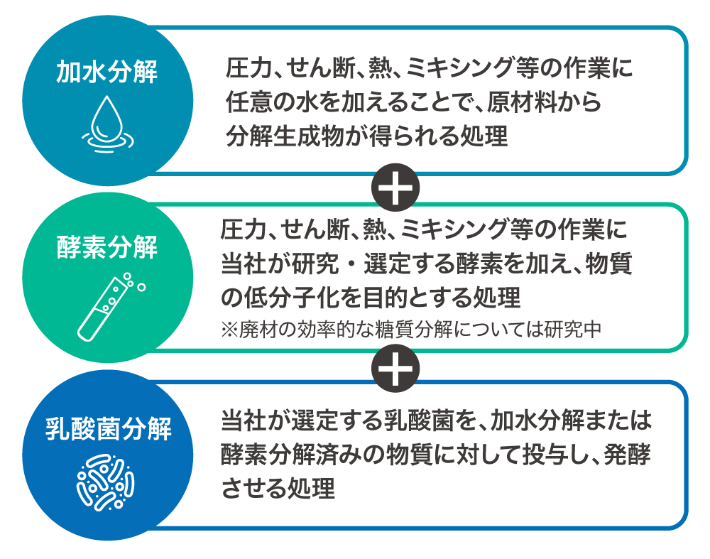 具体的には、加水分解/酵素分解/乳酸菌分解を現在のコア技術とし、セルロースの効率的な分解技術も取り入れています。