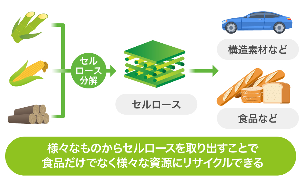 ã»ã«ããŒã¹ãšã¯ãæ€ç©çްèã®çްèå£ããã³æ€ç©ç¹ç¶ã®äž»æåã§ãé£åæ·»å ç©ãç¹ç¶ãæš¹èãæç±æãªã©ã®å¹ åºãçšéãæã¡ãŸããããããä»ãŸã§ã®æè¡ã§ã¯é£åãªã©ã®ã»ã«ããŒã¹ãåè§£ã§ããªãã£ãããã«ããªãµã€ã¯ã«ã§ãããã®ãŸãŸå»æ£ãããŠããŸããã