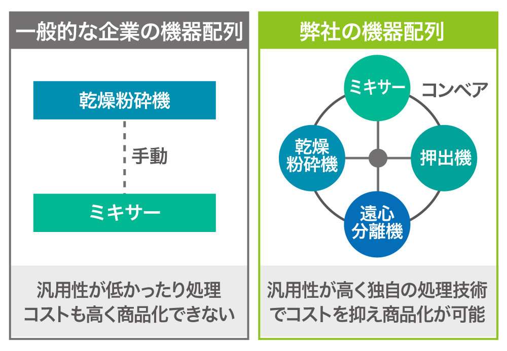弊社の一般製造業との大きな違いは、機械技術を研究・開発し、食品廃材を活用するために実用機(ラボ機ではない)を使用した研究も行っていくことです。これらのことを事業としてやっていくには、熱意とフットワークのあるベンチャー企業でなくては実現できないと考えています。