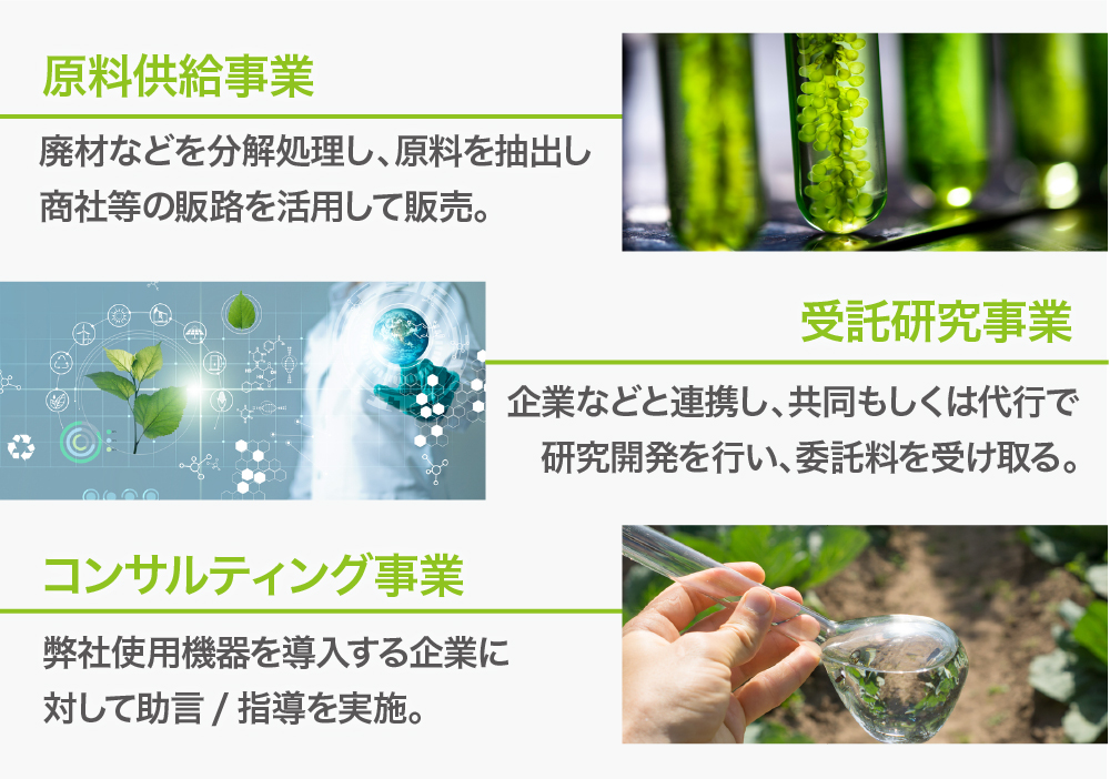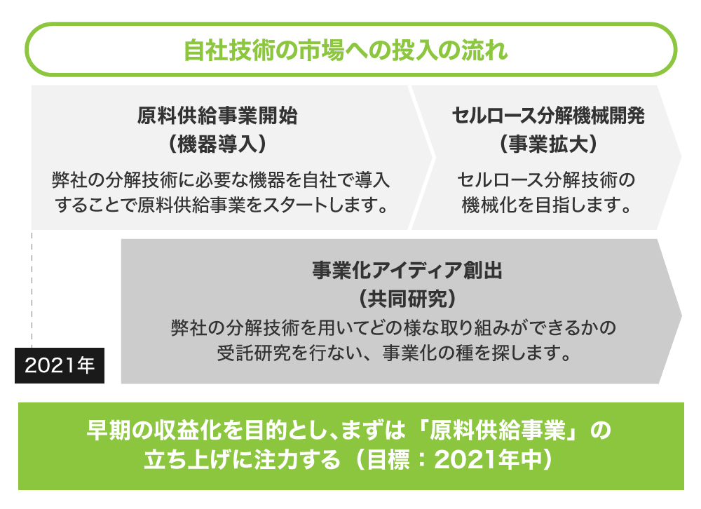 弊社の技術を活用したマネタイズ方法は、「原料供給事業」「受託研究事業」「コンサルティング事業」を通して行う予定です。