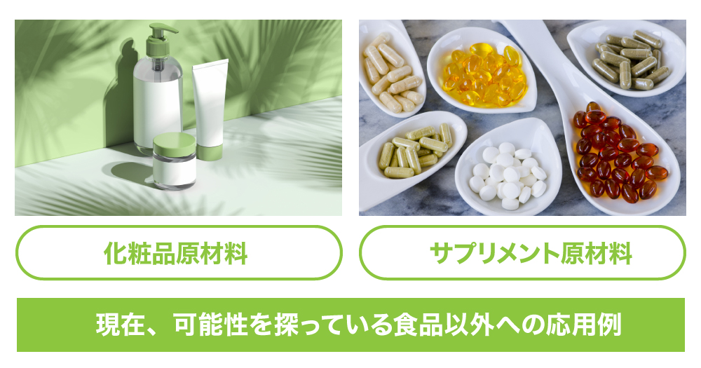 しかし、弊社の分解技術が活用できる範囲は食品だけに留まらず、様々な製品への応用が可能です。その中でも、現在は「化粧品」や「サプリメント」の商品化への応用にて引き合いをいただいています。