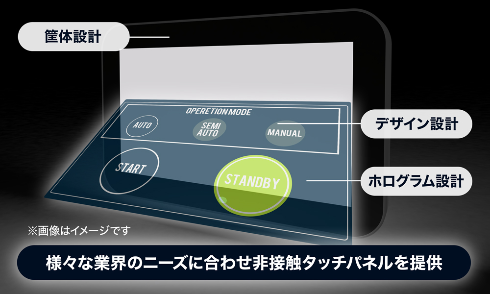 弊社は顕著化しつつある“非接触ニーズ”に応えるべく、ホログラム技術を活用した非接触型ホログラムタッチディスプレイを開発していきます(ホログラム技術は他社のものになります)。設計やデザイン、部材調達、製作までをワンストップで行ない様々な業界向けにニーズに合わせて応えていきます。
