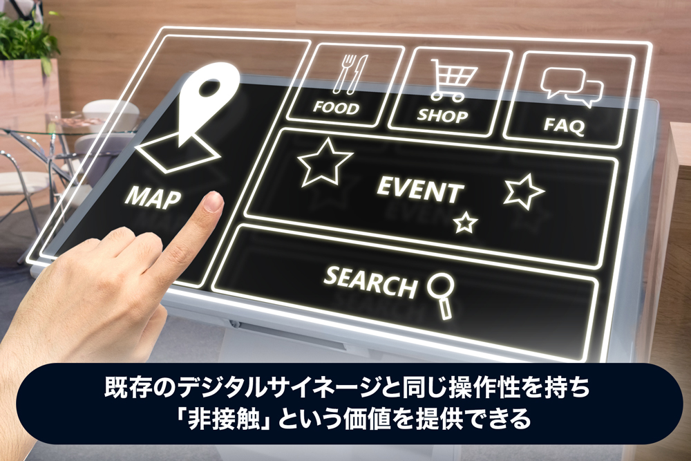 非接触型ホログラムタッチディスプレイの特徴は、指を空中で動かすだけでタッチパネルに触れずに画面操作を行うことができる点です。既存のデジタルサイネージと同じ様な仕組みで活用できるので、企業や店舗からすれば省人化に繋げていくことができます。