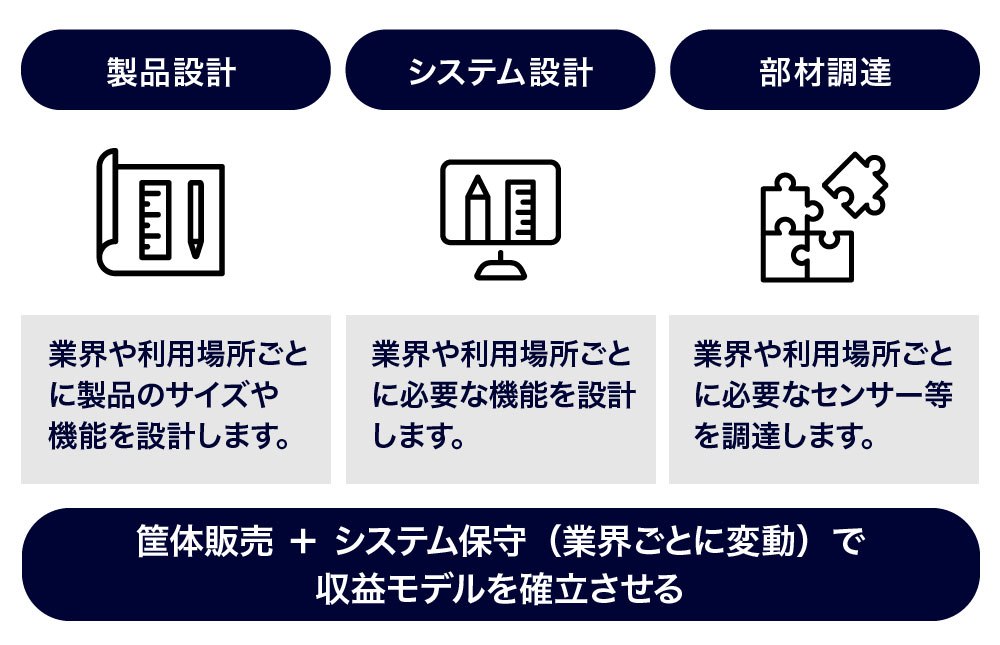 ビジネス構造として、筐体は量産化を行い、原価を抑えていきたいと考えています。また、内部システムは顧客ごとの開発対応が必要であるため、規格や仕様の統一が難しい特徴があります。そのため弊社は、筐体は安価で販売しながら、システム保守で安定的に利益を計上していく収益モデルを構築することを計画しています。