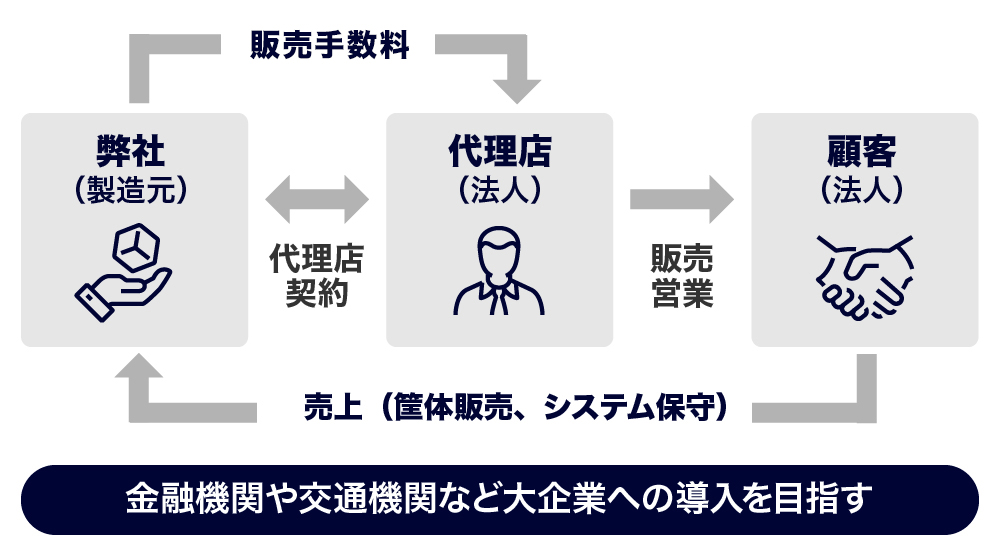弊社はあくまでも製品開発と保守に特化し、営業は代理店を通して行っていくことを計画しています。代理店に関しては、法人営業経験者が多数在籍する企業との連携を計画しており、同社には弊社製品デモなどで機動力を発揮していただき、はじめのターゲットである金融機関や交通機関など大企業への納品を目指し商談機会を多数創出していきたいと考えています。