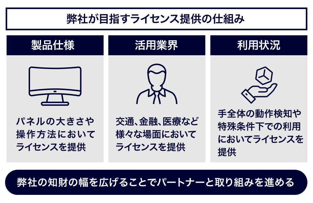 すでに、弊社製品に関する特許を出願していますが、弊社の知財を活用することで、自社による新製品開発にとどまらず「非接触」市場に関心を示す他企業との協業が可能になると考えています。それにより、ライセンス提供など保守以外の収益パターンを増やすことも可能になりますので、利益最大化を第一に特許戦略を練り効果的な知財戦略を実践していきます。