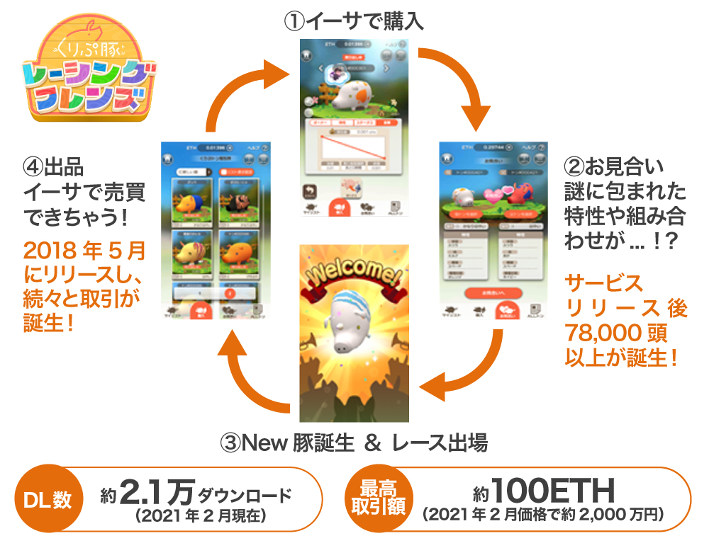 その取り組みへの第一弾として、2018年に国内初のブロックチェーンゲーム「くりぷ豚(トン)」をリリースしました。「くりぷ豚」は、ゲーム内で豚を買い、配合させながらオリジナルの豚を育てていくゲームです。また、その豚はレースで走らせてバトルをすることで、世界に1頭しかいない、オリジナルの豚を育成することができます。そして、その豚は売却することができ、得た資金で新しい豚を買うといったこともできます。