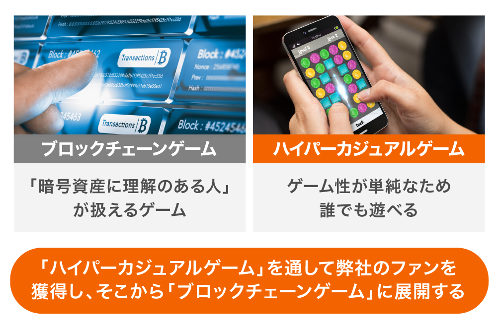 そこで原点に戻り、ゲームでヒットタイトルを生み出すことで、弊社のゲームファンを獲得し、そこからブロックチェーンゲームのユースケースを生み出す戦略に方向転換しました。そして、そのためにまずは「ハイパーカジュアルゲーム」と呼ばれるスマホゲームの開発に注力しています。