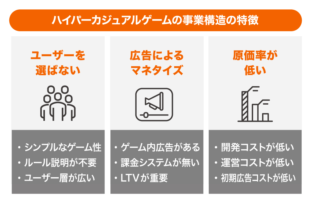 「ハイパーカジュアルゲーム」は、近年市場が急拡大しており、「ゲーム操作の複雑さ」や「課金」がないので、年齢や性別、国籍などを問わず遊べる点が特徴です。また、集客やマネタイズ方法が「広告」により成り立っているので、ゲームをインストールしてみたくなる工夫や、広告を再生させる工夫により、LTV(Life Time Value:顧客生涯価値)を伸ばすことができます。さらに、運営上のメリットとして、ゲーム運営用サーバーがいらない為、管理費を抑えられるという利点もあります。