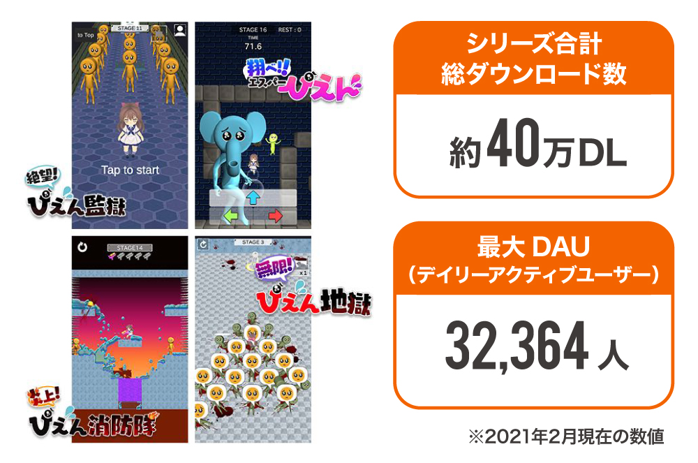弊社は、この点に着目しながら、近年の流行語である「ぴえん」をキャラクターにしたハイパーカジュアルゲーム『ぴえんシリーズ』を開発しました。その結果、6作品をリリースし、総ダウンロード数40万DL超、最大DAU(デイリーアクティブユーザー)32,364人、平均DAU8,000〜10,000人ほどにまで成長させることができました。