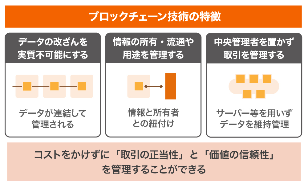 2008年ごろに誕生したブロックチェーン技術は世界中から「インターネットの次の画期的な技術」として注目を集めています。ブロックチェーン技術は、「記録の透明性」「改ざんが困難」「スマートコントラクト(第三者機関がいなくても契約状況の把握ができる仕組み)」といった特徴を持っていることから、「資産の安全な取引」を求める金融領域をはじめとして普及が進んでいます。