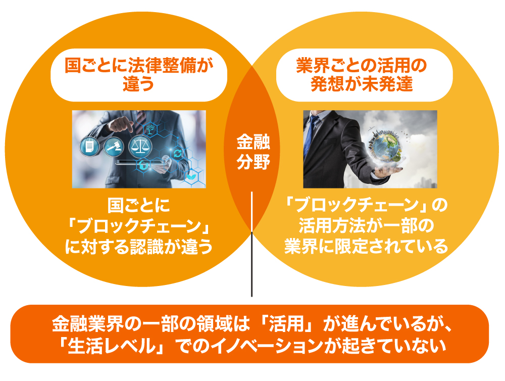 そんな、次世代の情報管理の仕組みを持つブロックチェーン技術ですが、ユースケースが海外中心であったり、法律が国ごとに違う為、他国のサービスが自国で使えないなど、活用がまだまだ進んでいません。また、業界ごとの慣習に合わせて、どの様に活用していくかの発想の切り替えも難しい部分があります。