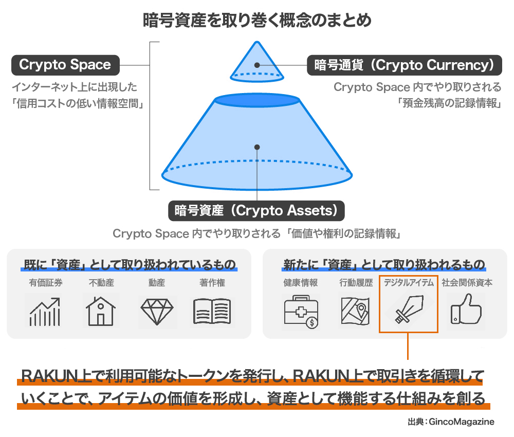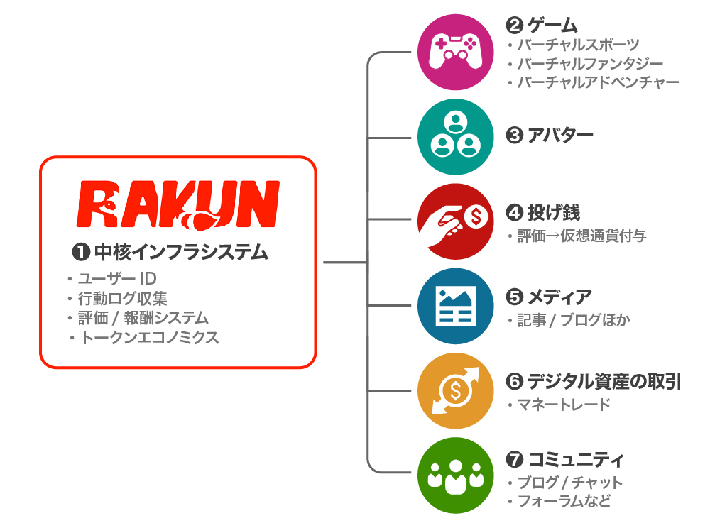 「RAKUN」は、ユーザーのデジタル資産構築の基盤をなすものです。ここに、他社製ゲームの相乗り、さらに、アバターや、メディア、ファンディング等が参画していくことで、「RAKUトークン」の活用場所や、アイテムの利用場所の拡大を行い、独自の経済圏を生み出すために創りました。