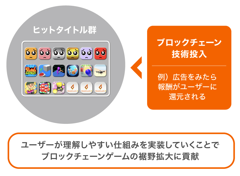 そこで、弊社は「広告をみたらユーザーにもインセンティブ(暗号通貨付与など)が発生する」といった様な、ブロックチェーンゲームのもっとわかりやすい仕組みを創出し、業界自体を盛り上げたいと考えています。