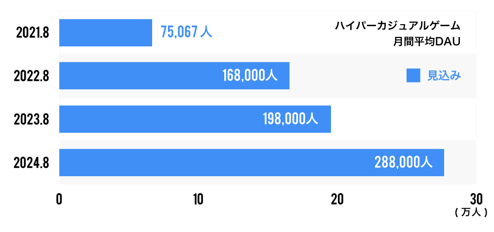 現在、これらのゲームの月間売上高は数百万円ほどですが、DAUを2.5万人ほどにまで伸ばすことで、ハイパーカジュアルゲーム事業単体で収益黒字化を達成できます。