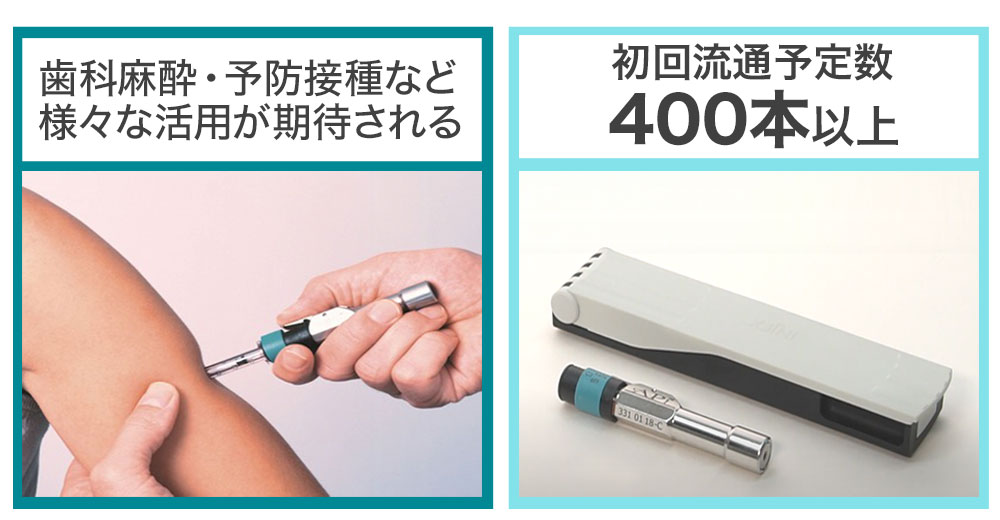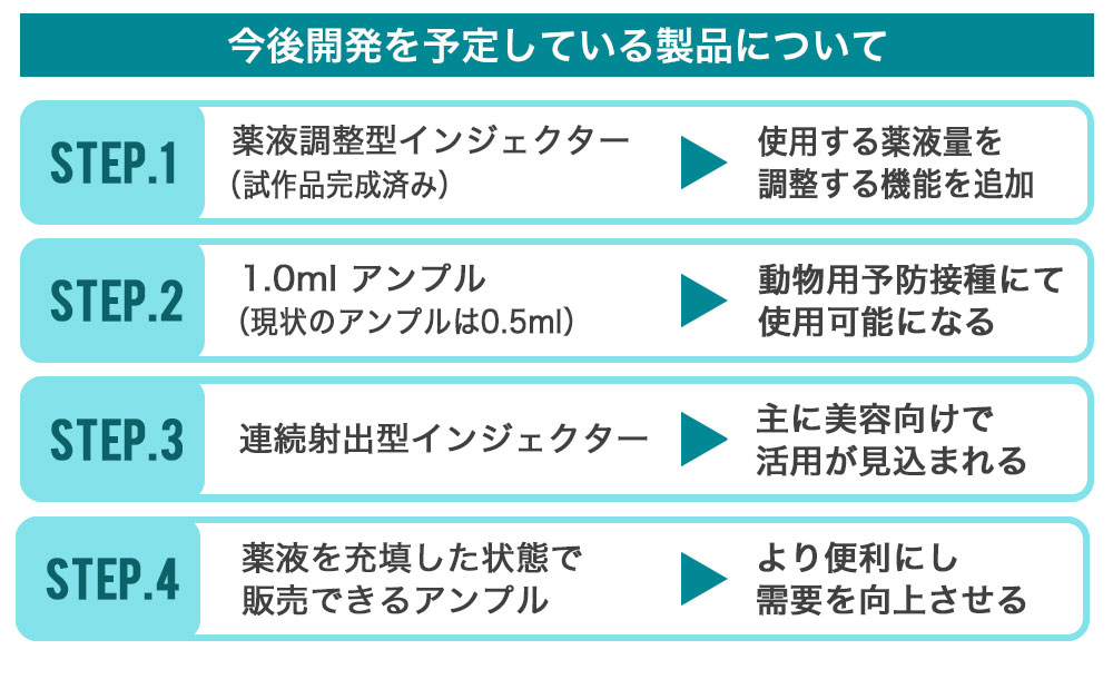 今後は、「Injex50」の販売力を強化し、歯科を皮切りに、ワクチン接種、不妊治療や成長ホルモンなど自己注射関連や、インスリン、美容、獣医領域などありとあらゆる医療領域に製品の優位性を説明し、拡販していく計画です。