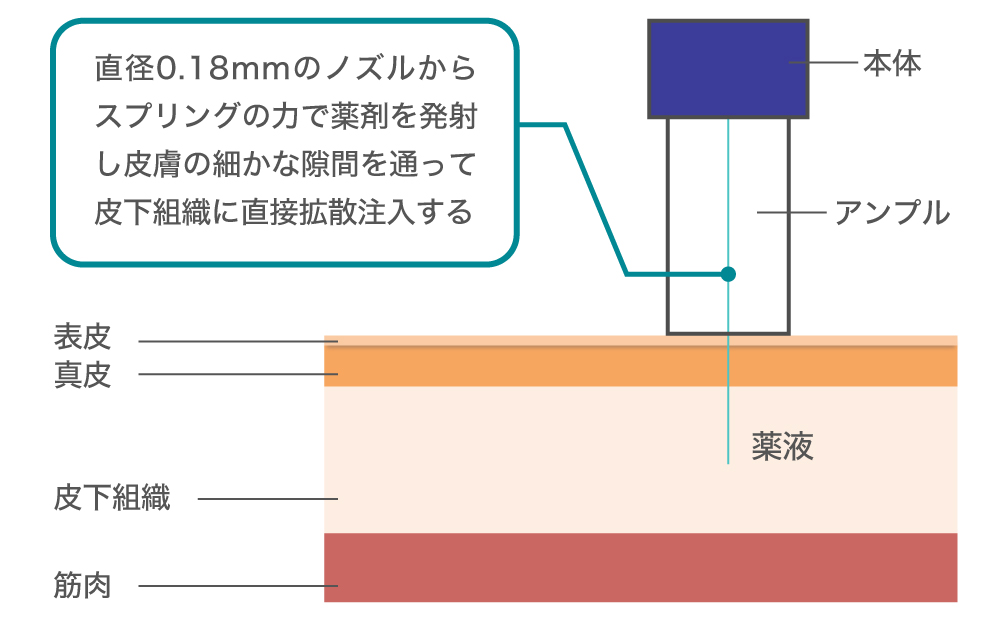 直径0.18ミリのノズルからスプリングの力により高圧・高速のジェット流で皮膚内に薬液を直接拡散注入する仕組みになっています。