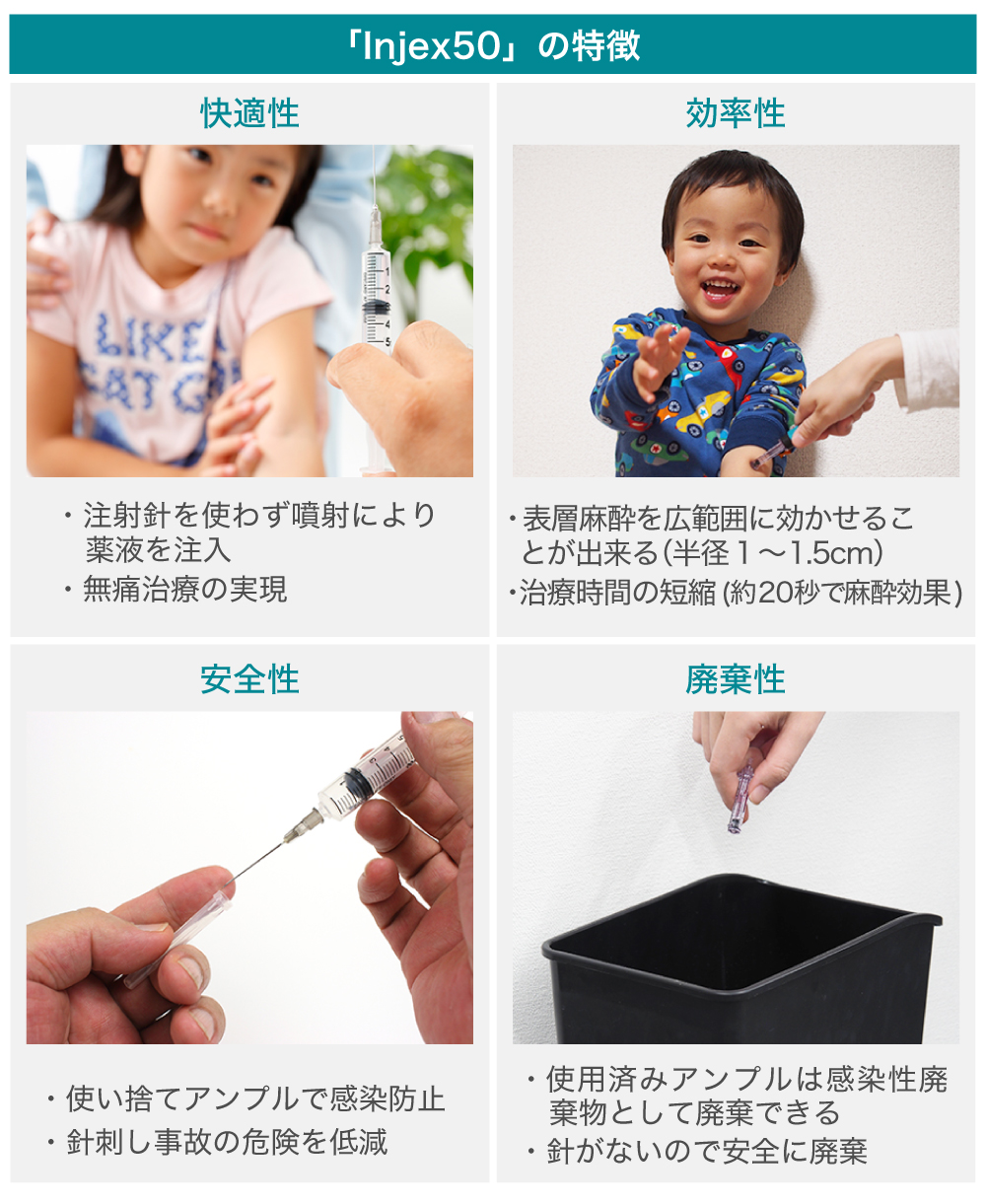 これは、体に針を刺入せず、微細なジェット流で薬液を皮下注射(皮下組織に薬物を注入する注射)するもので、注射による針の痛みを軽減することができます。