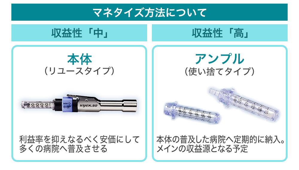 注射器本体(インジェクター)の導入が完了したら、使い捨てで利用するアンプルを定期的に納品して安定的に収益を確保する計画です。