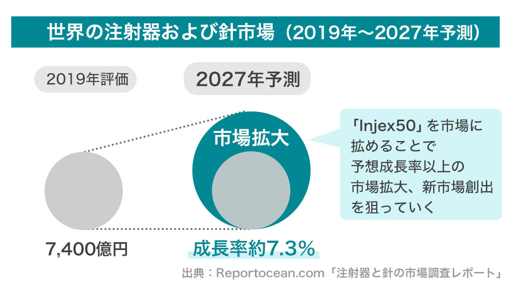 世界の注射器および針市場は2019年に約7,500億円と評価され、2020年から2027年の予測期間にわたって7.3%を超える成長率で成長すると予想されています(出典:Reportocean.com)。